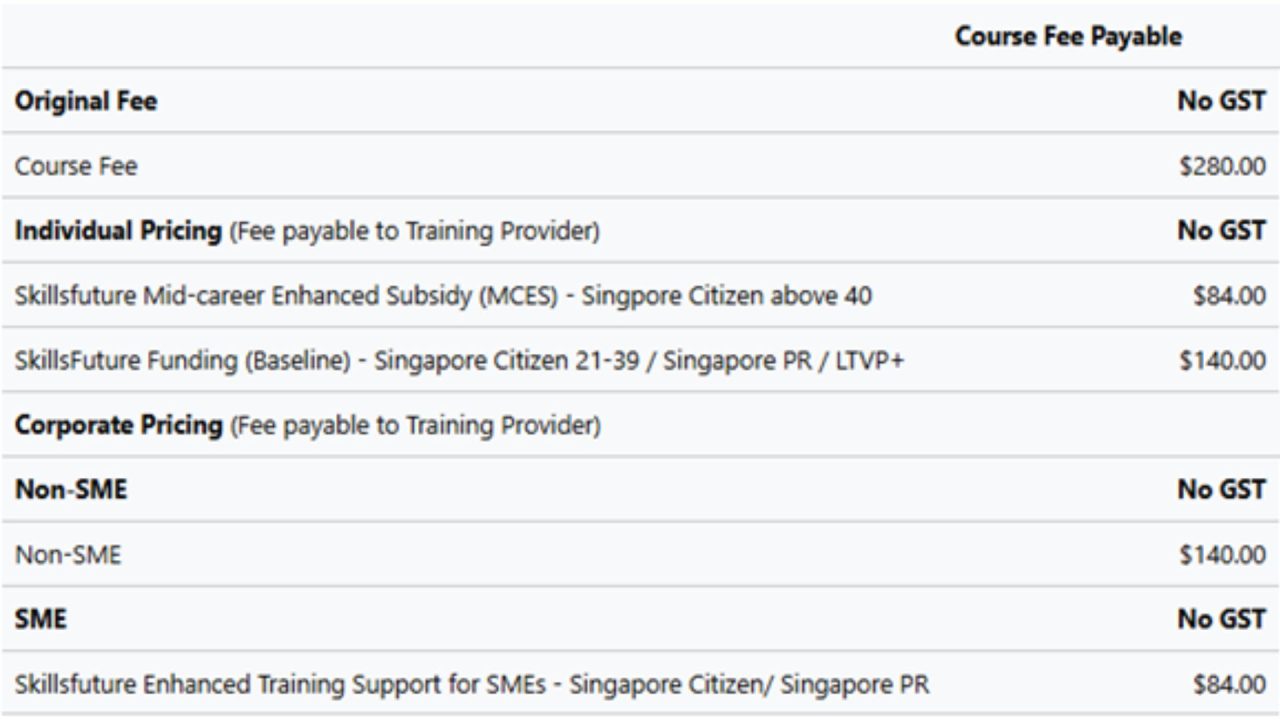 • SkillsFuture Funding (Baseline) – Singapore Citizen 21-39/ Singapore PR/ LTVP+